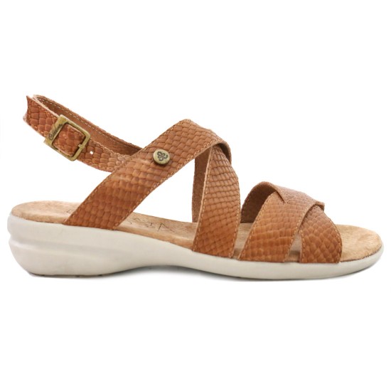 Sandalia Urbana de cuero de vibora con tiras cruzadas y hebilla regulable en el talon. Colores: Beige y Celeste. Con base de goma flexible antideslizante de 3.2 cm. Plantilla y forreria de cuero de chancho.