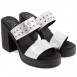 Sandalia urbana con dos faja en el empeine y apliques de tachas. Base de goma de 2,5 cm y 10 cm de altura en el taco. Forrería y plantilla en eco-cuero. Aplique de logo en metal.