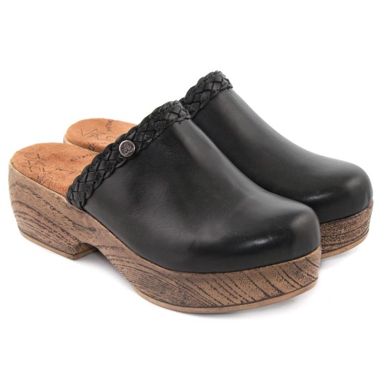 Sandalia Urbana tipo zueco de cuero liso con detalle trenzado. Colores: Negro, Suela. Base ultra liviana de 5 cm trapeada. Plantilla de microfibra y forreria de eco-cuero.