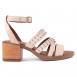 Sandalia urbana con tira cruzada en el empeine, detalles de remaches. Hebilla tipo pulsera en el tobillo. Base de goma de 1 cm y 6 cm de altura en el taco. Forrería y plantilla en eco-cuero. Aplique de logo en metal.