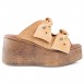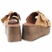 Sandalia urbana capellada de gamuza combinado con nobuck y moños en el empeine. Apliques de remaches. Base plataforma ultra liviana de 8 cm. de altura, símil madera. Forrería y plantilla en eco-cuero. Aplique de logo en metal.