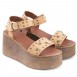 Trella Sandalia urbana con faja capellada de nobuk y apliques de remaches y estrellas. Hebilla regulable en el talón. Base plataforma ultra liviana de 8 cm. de altura, símil madera. Forrería y plantilla en eco-cuero. Aplique de logo en metal.